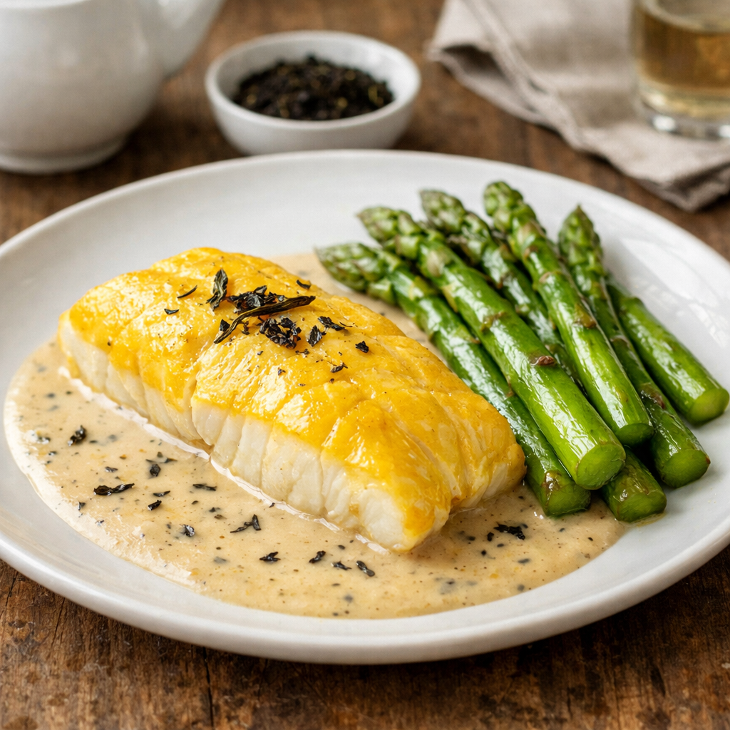 - Réchauffer les asperges, les disposer dans les assiettes, verser la sauce crème au thé au fond, puis déposer le poisson par-dessus.