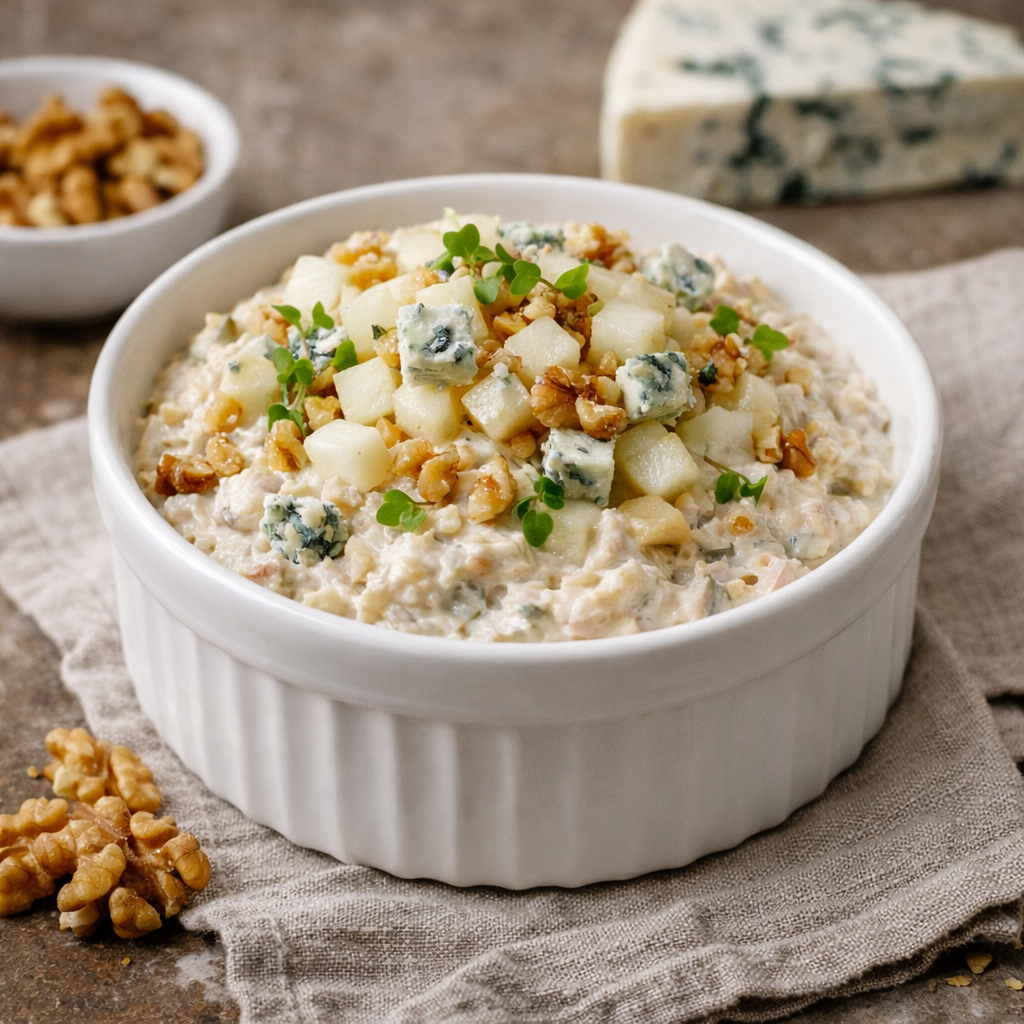 - Ajouter le fromage blanc, le roquefort en petits morceaux, les dés de poire et quelques noix concassées.