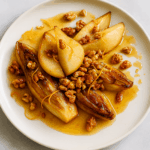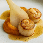 - Saint-Jacques rôties aux lamelles de poire au thé noir Minceur KamélyaUn trio de Saint-Jacques dorées, purée de potimarron et poire au thé noir… une assiette qui murmure « goûte-moi ». Ingrédients : Préparation :