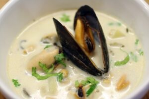 - Moules bouchot façon « Clam Chowder »Dès que les grands froids arrivent, les moules de bouchot deviennent plus charnues, plus savoureuses qu’à toute autre saison, parfois même plus laiteuses. Pour cette recette, je me suis inspiré d’un chowder venu tout droit de la Nouvelle‑Angleterre, au nord‑est des États‑Unis. Ingrédients : Préparation :