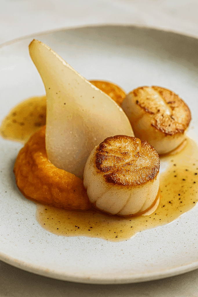 - Saint-Jacques rôties aux lamelles de poire au thé noir Minceur KamélyaUn trio de Saint-Jacques dorées, purée de potimarron et poire au thé noir… une assiette qui murmure « goûte-moi ». Ingrédients : Préparation :